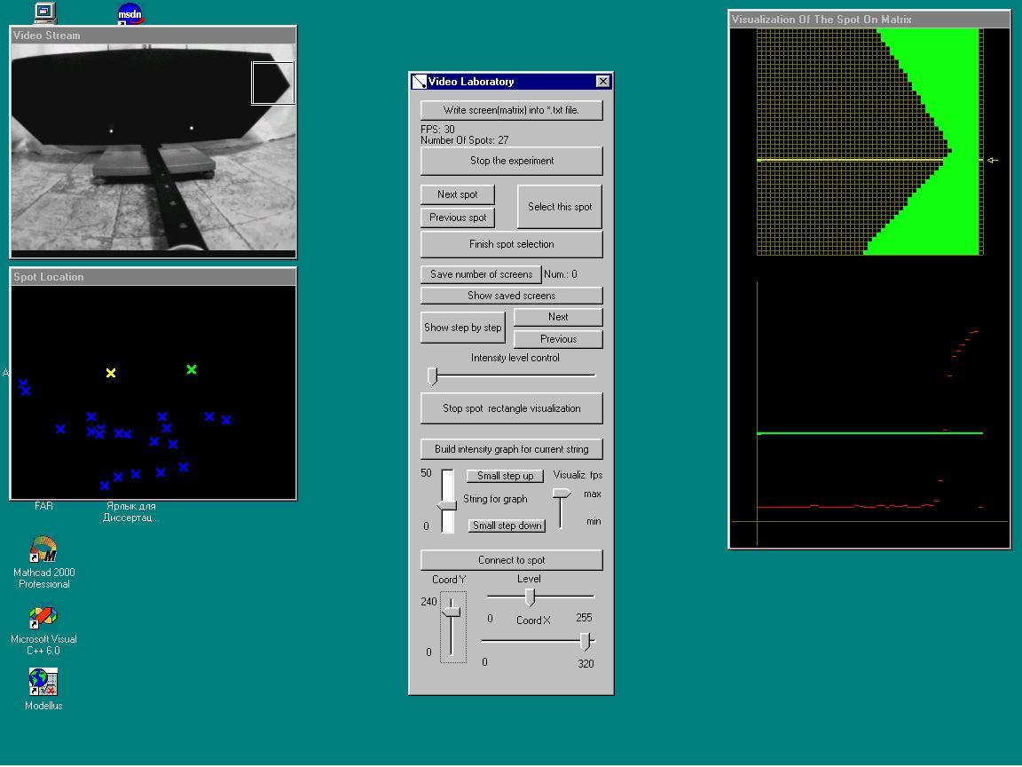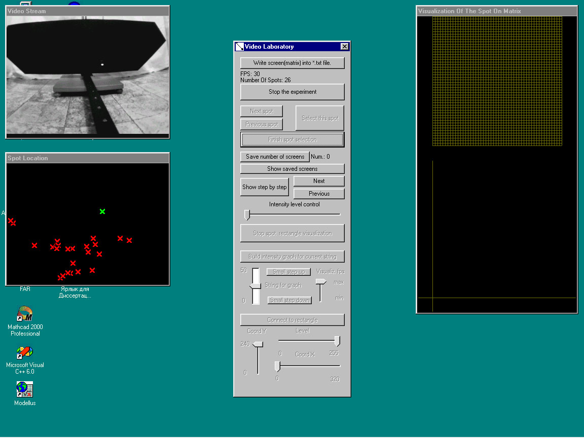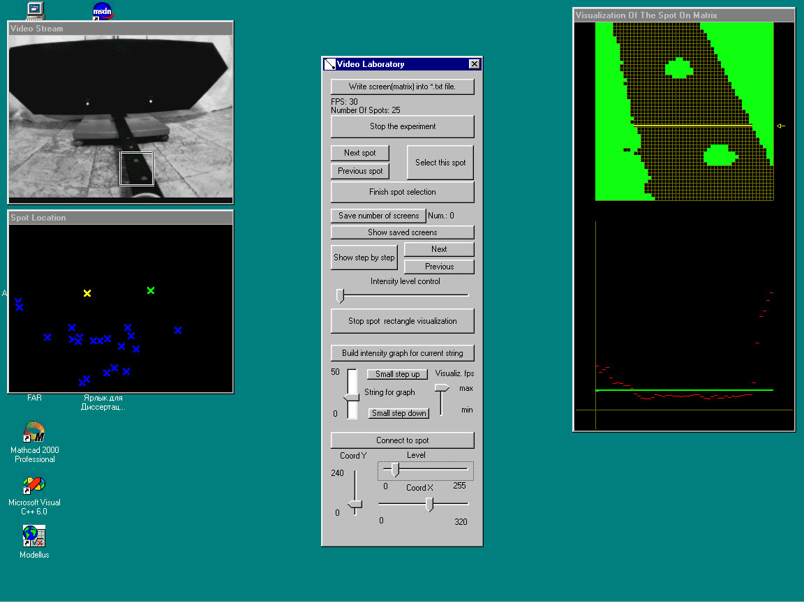 The incoming video stream window (1) is responsible for showing the incoming video, and founded spot visualization window (2) show all detected bright spots. Spots in this window can be different colors, depending on which mode of the program is running. The last window (4) is only necessary for the adjustment of the laboratory equipment. It allows for inspection of enlarged fragments of the video stream within the set brightness level, and it also builds the intensity graph for the selected fragment string.