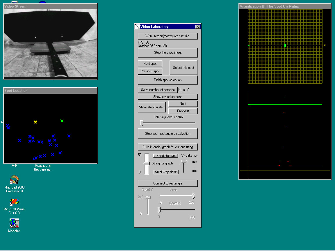 Окно вывода изображения на экран (1), выводит видео-поток с видеокамеры без какой-либо обработки. Другое окно визуализации (2) отображает все найденные яркие точки. Они выделяются разными цветами, в зависимости от режима работы. Окно (4) используется на этапе настройки лабораторной установки. Оно позволяет выводить увеличенные фрагменты изображения в соответствии с заданным уровнем интенсивности, и осуществляет построение графика интенсивностей для любой выбранной строчки изображения